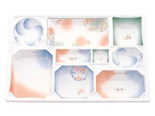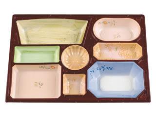 用途:会席膳用紙容器。中仕切はHIPS(PS)樹脂製です。冠婚葬祭の場所を選ばないデザインが料理を引き立てます。特に定置の柄が器一つ一つ個別の雰囲気をかもし出します。3500円〜6000円の料理に。 特徴:ワンタッチで組み立てられる、組み立て式の会席料理ボックスです。コンパクトに折りたたんだ状態でお届けしますので、収納スペースも取らず、強度も十分あります。 |