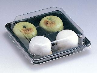 用途:和菓子4ヶ用。300円〜500円のものに。 特徴:蓋OPS(PS)、本体HIPS(PS)でできていて、蓋が嵌合で、本体に仕切りが付いています。内容物がずれにくく、蓋が外れにくくできています。 |