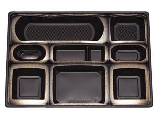 用途:会席膳用紙容器。中仕切はHIPS(PS)樹脂製です。冠婚葬祭の場所を選ばないデザインが料理を引き立てます。特に定置の柄が器一つ一つ個別の雰囲気をかもし出します。4000円〜8000円の料理に。 特徴:紙製。足付き(上げ底)でボリューム感があり、食膳を華やかに演出する最高級シリーズです。完全組み立て、完納ですから、組み立ての手間もかかりません。 |