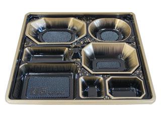 用途:冠婚葬祭時の会席料理。小さいサイズの物は高級な弁当に使用できます。1000円〜1500円の弁当に。 特徴:蓋はHIPS(PS)、本体は定位置で印刷しており、盛り付けした折のボリューム感があがります。本体はHIPS(PS)樹脂を使用しています。 |