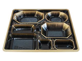用途:冠婚葬祭時の会席料理。小さいサイズの物は高級な弁当に使用できます。1000円〜1500円の弁当に。 特徴:蓋はHIPS(PS)、本体は定位置で印刷しており、盛り付けした折のボリューム感があがります。本体はHIPS(PS)樹脂を使用しています。 |
