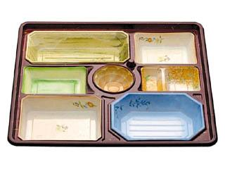 用途:冠婚葬祭時の会席料理。小さいサイズの物は高級な弁当に使用できます。1200円〜2500円の料理に。 特徴:蓋はHIPS(PS)、本体は定位置で印刷しており、盛り付けした折のボリューム感があがります。本体はHIPS(PS)樹脂を使用しています。 |