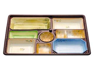 用途:冠婚葬祭時の会席料理。小さいサイズの物は高級な弁当に使用できます。2000円〜3500円の料理に。 特徴:蓋はHIPS(PS)、本体は定位置で印刷しており、盛り付けした折のボリューム感があがります。本体はHIPS(PS)樹脂を使用しています。 |
