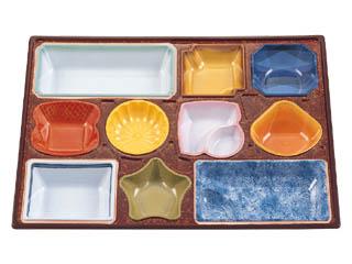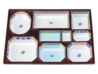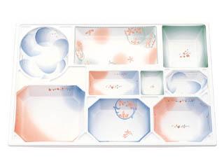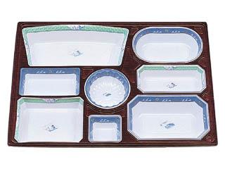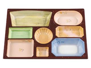用途:会席膳用紙容器。中仕切はHIPS(PS)樹脂製です。冠婚葬祭の場所を選ばないデザインが料理を引き立てます。特に定置の柄が器一つ一つ個別の雰囲気をかもし出します。5000円〜10000円の料理に。 特徴:紙製。足付き(上げ底)でボリューム感があり、食膳を華やかに演出する最高級シリーズです。完全組み立て、完納ですから、組み立ての手間もかかりません。 |