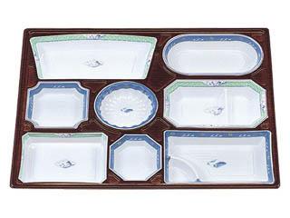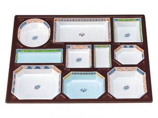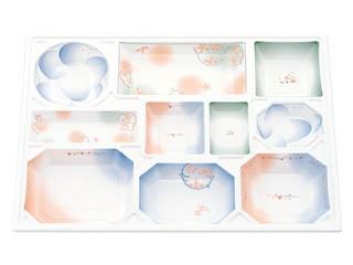 用途:会席膳用紙容器。中仕切はHIPS(PS)樹脂製です。冠婚葬祭の場所を選ばないデザインが料理を引き立てます。特に定置の柄が器一つ一つ個別の雰囲気をかもし出します。5000円〜12000円の料理に。 特徴:紙製。足付き(上げ底)でボリューム感があり、食膳を華やかに演出する最高級シリーズです。完全組み立て、完納ですから、組み立ての手間もかかりません。 |